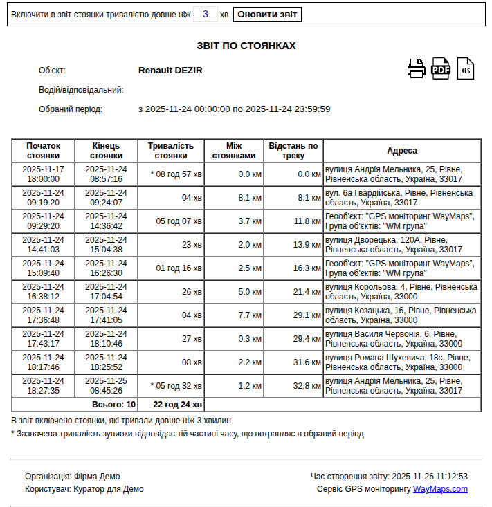 У звіт по стоянках додано додатковий стовпчик з відстанню між стоянками. Тепер, на конкретній стоянці, Ви можете бачити і пробіг з початку періода Звіту, і відстань від попередньої стоянки.