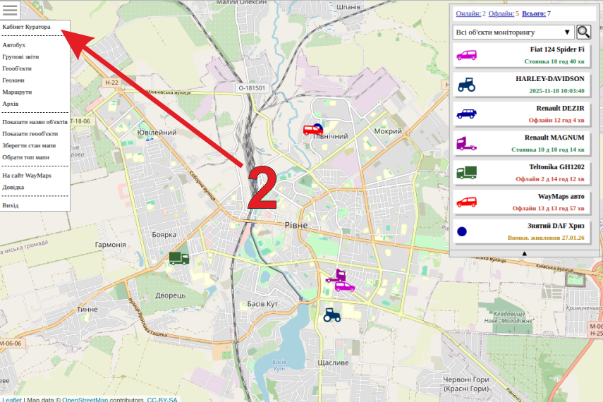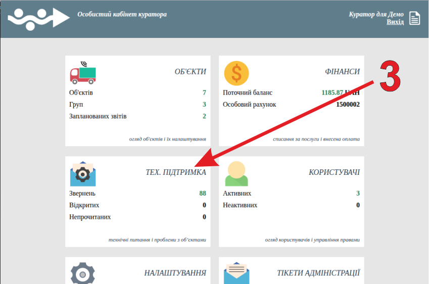 Примітка: Особистий Кабінет доступний виключно користувачам з правами Куратора, які мають доступ до всіх об'єктів спостереження. Для користувачів "з обмеженими правами" він не доступний.